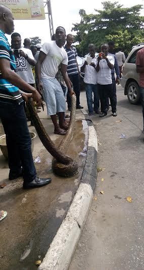 The python was said to the hanging around the bush and was killed by two young men passing by around the area. The hugeness of the python got people worried how it managed to get to that area of Lagos State. Passers by and onlookers stopped by to have a gaze and as well as a photo of the snake. You sabi naija people and their behaviours na.... more photos after the cut...